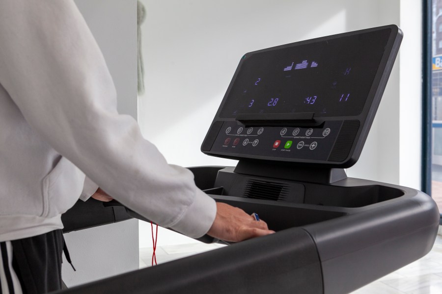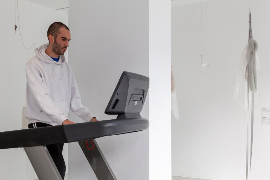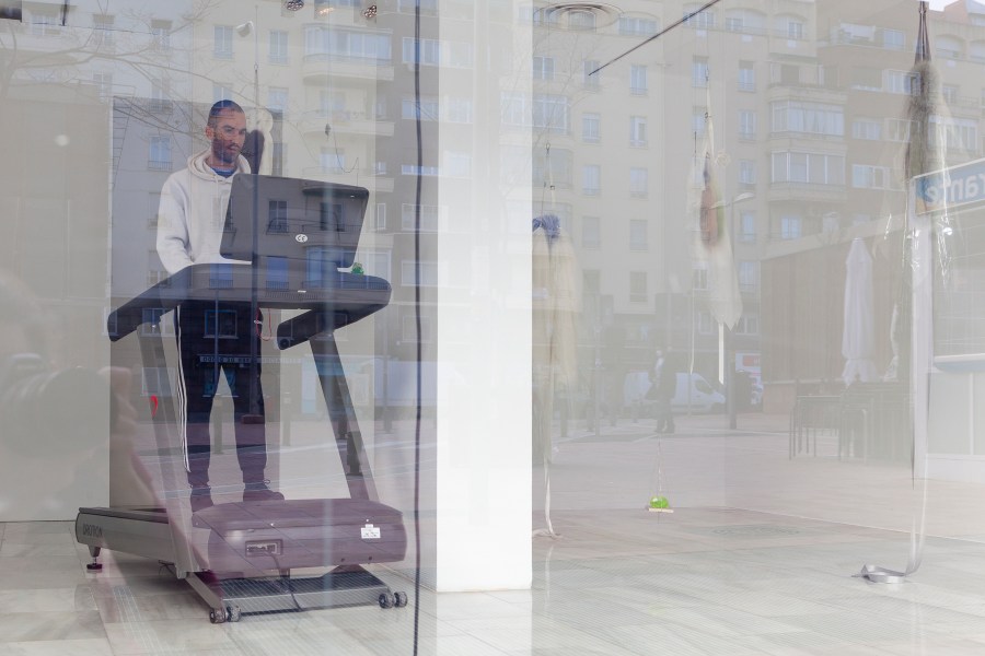 Esta pieza también, es, un ejercicio, una tarea y una acción. Un acto simple de un cuerpo que rutinariamente se desplaza a una sala de exposiciones en pleno invierno. Casi todos los días, algunos días. Entre el 17 de diciembre de 2020 al 18 de febrero de 2021. Un cuerpo que toma el metro desde Legazpi hasta la Avenida de América para llegar a un interior y ponerse a caminar en un punto fijo. Que se mueve pero que no se desplaza, que no va a ningún lado. Un cuerpo que sobre una máquina de correr camina, sin más, anda, trota y hace una media de 22 kms diarios. Un cuerpo que también se cansa, que se agota y que, por supuesto, se aburre. Un cuerpo común que saluda a los visitantes y que charla con los visitantes sobre la exposición, sobre las piezas, sobre el COVID y sobre un partido de tenis que vieron ayer y sobre las cañas que se van a tomar después. Un cuerpo que no tiene razones existenciales para estar ahí. Un cuerpo sin más, un cuerpo sin fe. Un cuerpo que no pretende llegar a ningún lugar, son objetivo. Un cuerpo cansado del mundo pero que pertenece al mundo y que ama el mundo y que odia el mundo. Un cuerpo de carne ordinaria que solo quiere estar y que solo quiere experimentar. Un cuerpo contemporáneo y vulgar, que no quiere ponerse al límite, que quiere, a toda costa, evitar el límite. Un cuerpo que también, claro está, quiere dormir casa cada día, al que le gusta descansar.